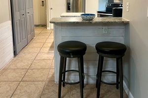 There are beautiful granite countertops with shiplap-covered walls, cabinets, USB outlets, a new larger sink with tile backsplash, and hanging bar lights with new bar stools! 4